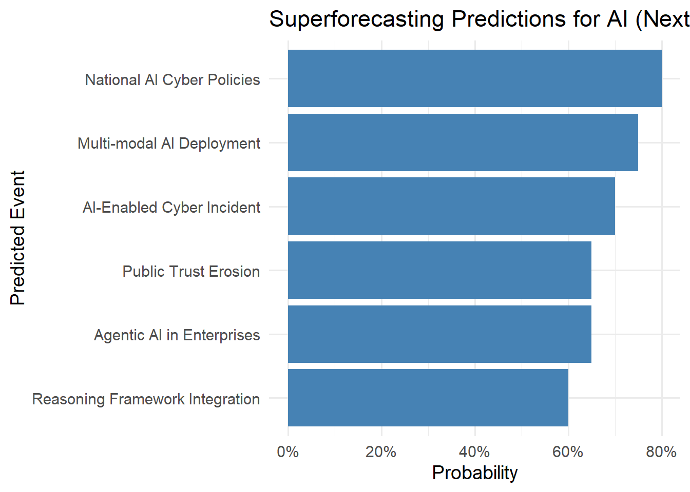 | Worst Case | High-profile AI-driven cyberattacks erode trust, regulatory backlash stalls innovation, and reasoning methods fail to mature fast enough. | ~20% | Slowed adoption, fragmented markets, and delayed realization of AI-driven productivity gains. |